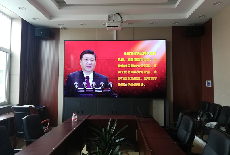 該案例中,維康國際為遼寧沈陽某檢察院提供一套會議大屏,采用3行3列,機柜式安裝安裝的55寸液晶拼接屏,超窄邊設計,雙邊物理拼縫僅有0.88mm,有著很好的大屏畫面一體化顯示效果。