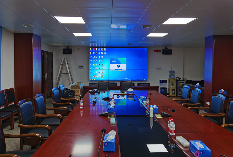 本案例中,是維康國際為廣州某交通運輸局提供的一套會議室顯示大屏,由3X3拼接、55寸3.5mm液晶拼接屏組成,主要用來信息顯示及視頻會議使用。