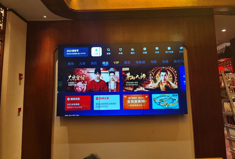 本案例中,維康國際為深圳羅湖某休閑會所提供一套顯示大屏,由3x3拼接、55寸液晶拼接屏組成,屏體采用LG超窄邊1.8mm原裝液晶面板,讓大屏幕畫面顯示更清晰細膩,拼縫更小,有著很好的一體化顯示效果。