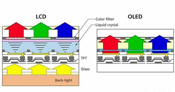 構成材料:OLED結構簡單,工序少,藍光材料衰變致壽命較短