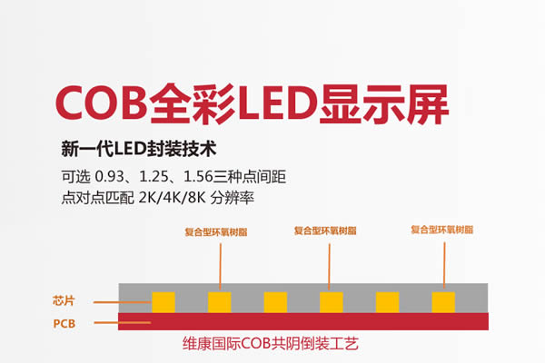 本產品采用 COB封裝技術,和傳統的 SMD 表貼式封裝不同,它是將發光芯片集成在 PCB 板中,而非一顆顆焊接于 PCB。該技術有效提升了 LED顯示屏可靠性、發光光色,防護性能等。