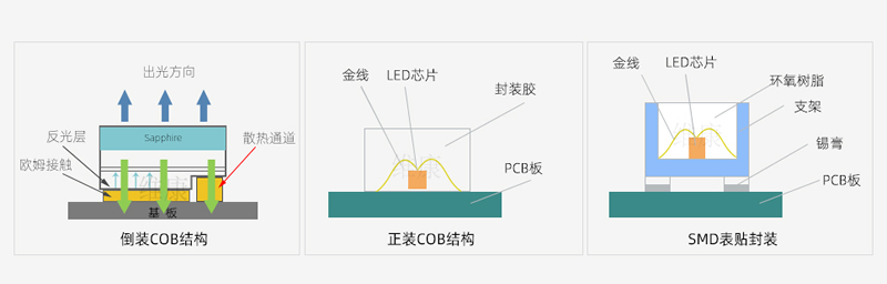 相比SMD封裝工藝而言,COB封裝不再是先封裝成燈珠再焊接,而是直接把LED芯片封裝在PCB基板上,所以它也叫板上芯片封裝,它簡化了整個封裝的流程,不再需要支架與回流焊環節,從而使得整個芯片與基板呈一個平面,這也解決了后期的掉燈現象出現。