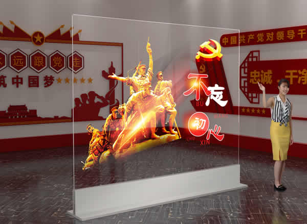 光學透明屏的顯示是采用光學數(shù)字技術(shù),具有全透明、超高清、大面積、柔輕薄的特質(zhì),對透明介質(zhì)材料進行多層結(jié)構(gòu)調(diào)整,只會對激光光源方向的光進行調(diào)控,對其他方向的光允許完全透過,從而實現(xiàn)全透明、高清晰的圖像顯示。通過“透明高清的顯示屏幕、虛實結(jié)合的顯示形式、AR智能的顯示手段”,創(chuàng)新的解決了黨建“靜態(tài)展示不生動沒有帶入感,動態(tài)展示形式不新穎不吸睛,單向展示互動性差”等“老問題”。帶給觀眾前所未有的新鮮感、科技感,讓觀眾情不自禁的駐足觀看。透明高清的顯示屏,成為黨建的一扇窗口。