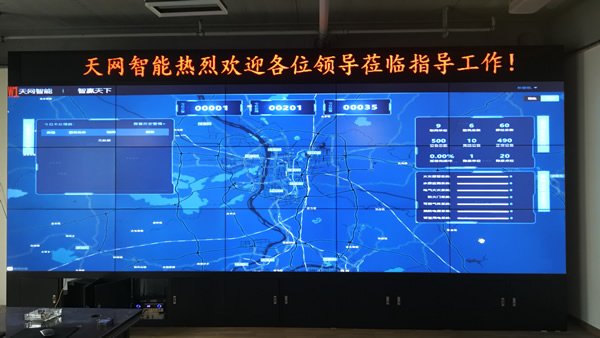 這套大屏安裝在湖南省天網智能科技有限公司的展廳,采用3x5拼接、55寸液晶拼接屏,雙邊拼縫為3.5mm,主要用來大數據顯示使用。
