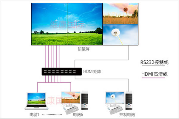 在實際應用中,會議大屏上面一般只需要顯示一個畫面,這時只需要搭配一個分配器控制就可以。但是有些時候還會輸出多個電腦的信號,分別顯示在不同的區域,這時就需要使用數字矩陣,如需要4臺電腦信號輸入,共12塊大屏,那么可以采用一臺4進12出的HDMI高清矩陣,這樣就可以任意切換各個信號源在某一塊或相臨的幾塊屏幕上顯示。