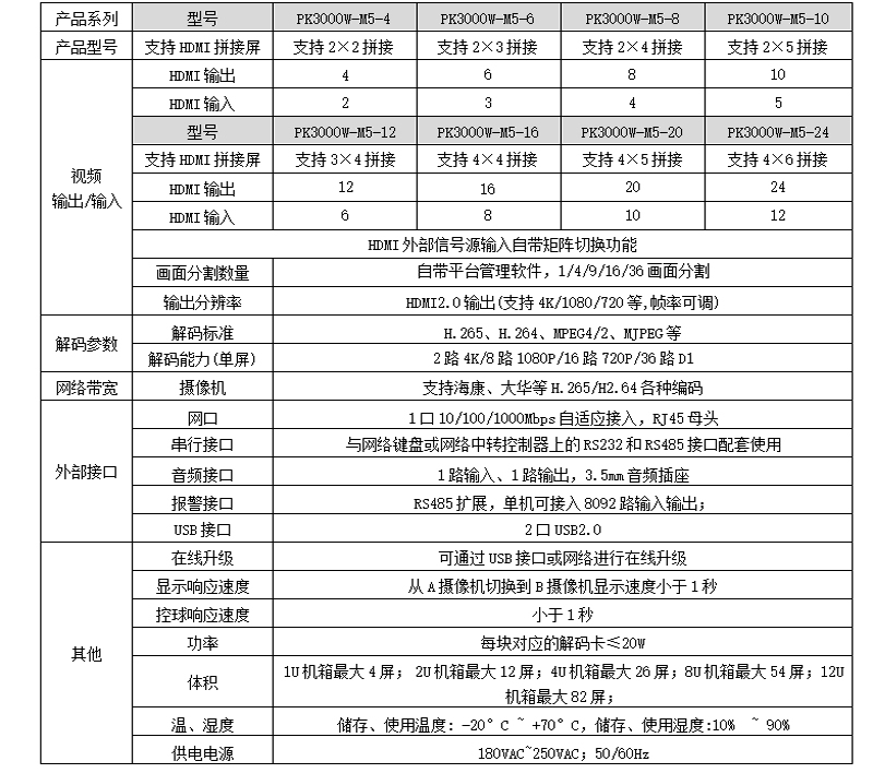 PK3000W-M5數(shù)字矩陣采用最新的安防專用編解碼芯片,專為H.265標準及4K超高清編解碼而設計,產品采用嵌入式LINUX架構,保障系統(tǒng)的穩(wěn)定運行,采用模塊化設計,可以在大型、超大型數(shù)字安防監(jiān)控系統(tǒng)中實現(xiàn)解碼、編碼、拼接、分割、畫中畫、漫游等功能,為工程項目最大程序解決大數(shù)據(jù)數(shù)字化監(jiān)控系統(tǒng)提供解碼上墻及多信號輸入編碼等提供一站式解決方案;設備采用全鋁標準機箱,結構上大氣美觀可靠,散熱性結構化好。