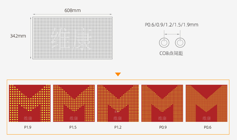 我公司提供5款COB小間距LED顯示屏,分別是點間距為1.9mm、1.5mm、1.2mm、0.9mm、0.6mm。傳統的SMD封裝技術受制于焊接技術的原理,突破1mm以下的點間距變得非常困難,而且死燈率過高,而COB小間距LED顯示屏不存在這一限制,通常點間距可以控制在0.6~2.0mm,能夠做到傳統LED小間距無法量產的P1.0以下的領域。