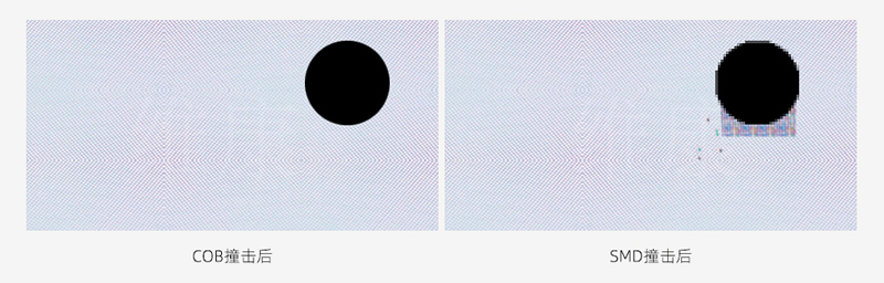 COB小間距LED顯示屏由于是直接把芯片封裝在了PCB基板上,在表面使用的環氧樹脂封裝,所以表面更加耐磨防撞,防塵防水,如下圖所示,在受到撞擊后,COB小間距LED顯示屏不會掉燈,而傳統的SMD表貼式LED屏則非常容易掉燈。