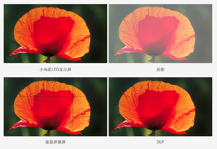 以下為小間距led顯示屏、投影、液晶拼接屏、DLP四種主流的大屏顯示技術的效果對比,通過對比可以看到投影由于對比度低導致屏幕發白,而液晶拼接屏與DLP都有不同程度的拼縫,P1.2小間距led顯示屏由于點間距只有1.2毫米,所以即沒有拼縫而且分辨率也有保證。