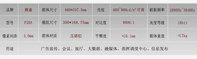 箱體尺寸600*337.5mm,為16:9比例,保證拼接時圖像不變形。亮度600~800cd/m2可調,對比度達8000:1,灰度等級16bit,色彩更加豐富。