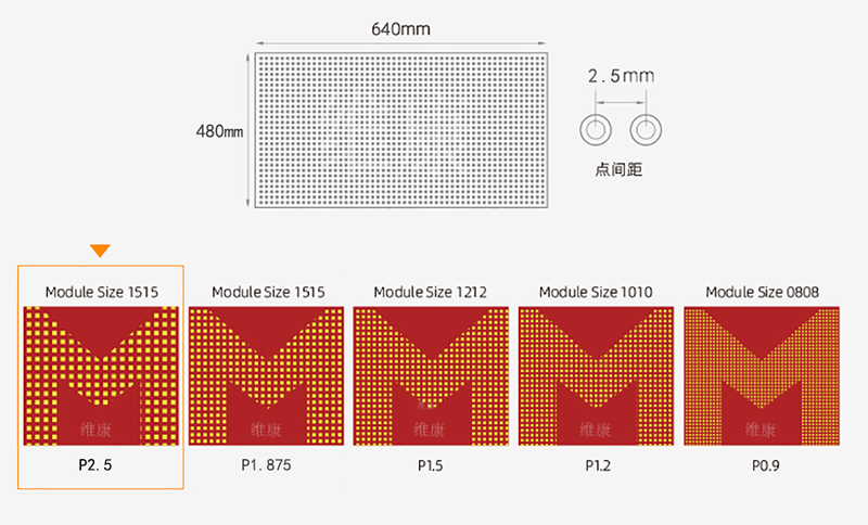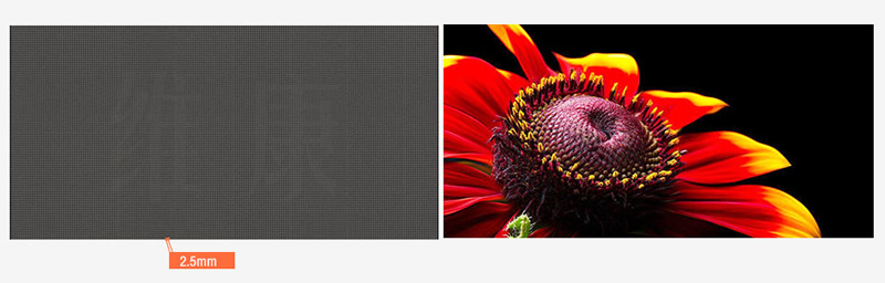 采用行業壓鑄鋁箱體,設計精度高,平整度高。箱體尺寸為640×480/(mm),模組尺寸寬320×高160mm,箱體重量7kg,亮度600~800cd/m2可調,像素點僅有2.5mm。