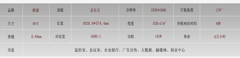 46寸拼接屏0.88mm拼縫的產品采用國產京東方面板組成,是目前除55寸以外另外一款可以做到0.88mm拼縫的產品,目前也只有京東方一款面板可選。
