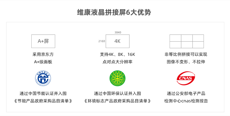 46寸拼接屏0.88mm產品經過了CQC中國質量認證中心檢測,取得了環保、節能認證,CNAS檢測報告等認證,產品質量穩定可靠。