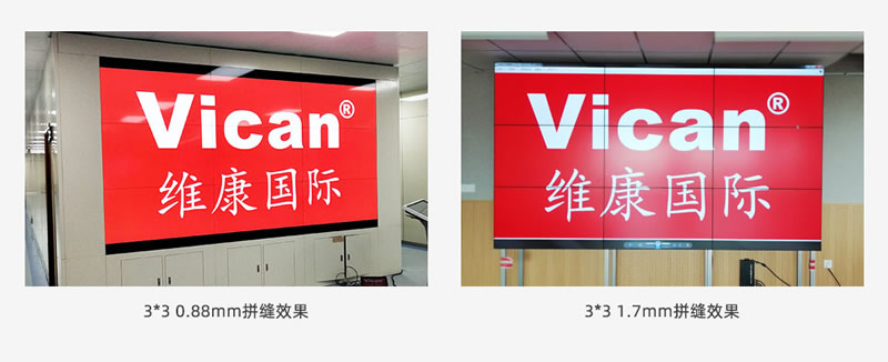 下圖是一組3*3的46寸拼接屏0.88mm與1.7mm液晶拼接屏的對比效果,二者大的區別就是拼縫上面,0.88mm的拼縫明顯更小,視覺效果更好。