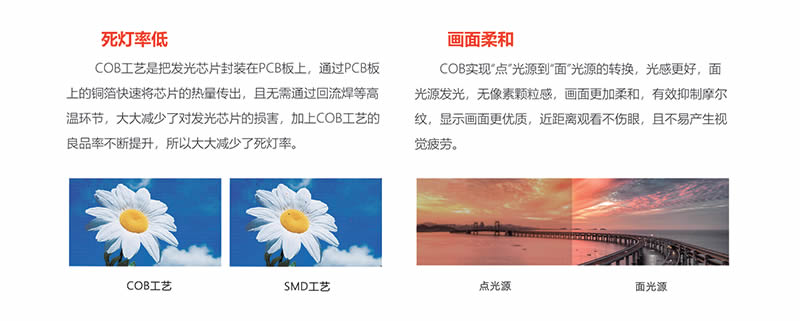 COB采用平面封裝,表面進行了特殊處理,有效減輕摩爾紋的產生。